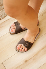 Brown oiled leather sandal with anatomical sole and adjustable buckle. Leather certified by suppliers Leather Working Group (LWG) with gold status.
