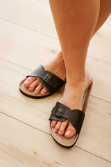 Sandalia negra con hebilla ajustable. Planta anatómica de corcho y foam. Calzado vegano aprobado por PETA, libre de animales y respetuoso con el medio ambiente. Diseñado y fabricado en nuestras fábricas de Elche, bajo una producción sostenible y proveedores locales.