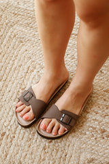 Sandalia marrón con hebilla ajustable. Planta anatómica de corcho y foam. Calzado vegano aprobado por PETA, libre de animales y respetuoso con el medio ambiente. Diseñado y fabricado en nuestras fábricas de Elche, bajo una producción sostenible y proveedores locales.